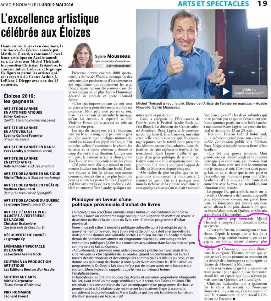 *** Le prix Alliance Réseau des grands espaces et RADARTS a été remis à Michel Thériault lors de la Francofête en Acadie. Il sera à Contact Ouest à Vancouver en septembre 2018.