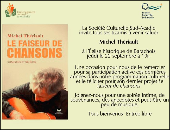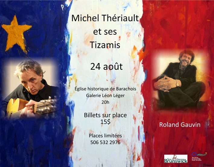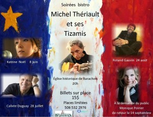 le samedi 28 juillet 2018 dans le cadre de la série de spectacles « Michel Thériault et ses Tizamis » à l’Église historique de Barachois présentée par la Société culturelle Sud-Acadie.