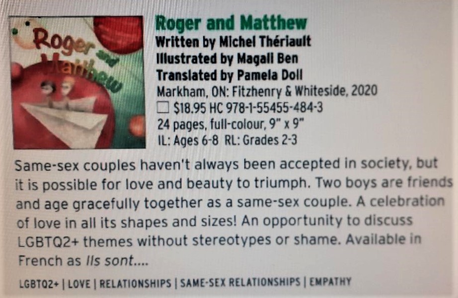 « Roger and Matthew » (version anglaise de « Ils sont…» publié chez Bouton d’or Acadie) sélectionné dans les « BEST BOOKS FOR KIDS & TEENS 2021 » du Canadian Children’s Book Centre (chanson « Roger et Mathieu » de mon disque « Drôle d’oiseau »)