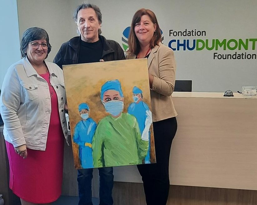 Don au Centre hospitalier universitaire Dr-Georges-L.-Dumont d’une peinture faite en période de pandémie avec comme titre : « MERCI / THANK YOU ». Dans la photo avec Thérèse Thériault, directrice des dons majeurs et planifiés de la Fondation CHU Dumont et Lisa Lyn Roy, directrice des activités hospitalières du Centre hospitalier universitaire Dr-Georges-L.-Dumont. Vous pouvez voir la peinture au deuxième étage de l’hôpital, près de la cafétéria ;