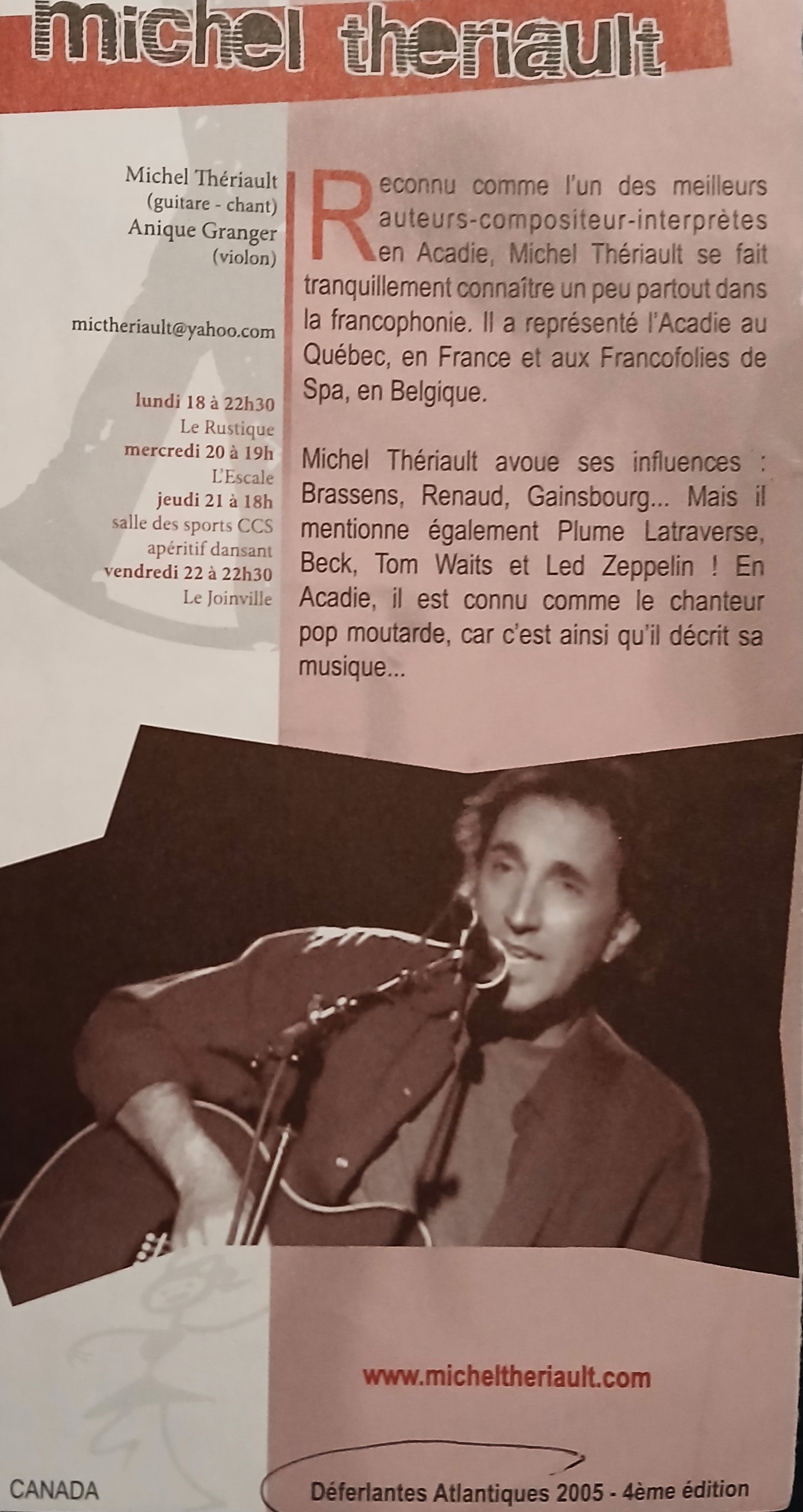 2005 : Au festival Les Déferlantes Atlantiques à Saint-Pierre et Miquelon (avec Anique Granger et Théo Brideau; en entrevue radio; et avec Roland Gauvin et Albert Weber) ;